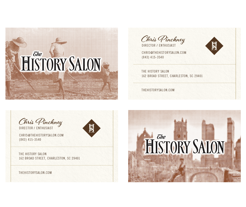 The History Salon gathers like-minded travelers to engage in critical conversation and moderated lecture about specific historical happenings within their original environment. Business connections make the unimaginable happen, including access to locations closed-off to the public and authentic artifacts that have never before seen the inside of a museum. This project was specifically about developing brand strategy, a visual identity and the position to draw visitors from the more intellectual museum experiences found around Charleston.