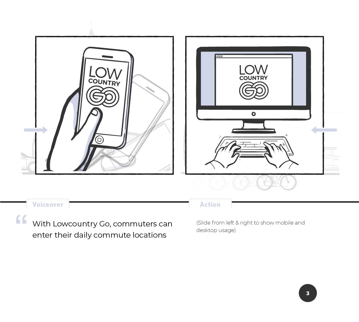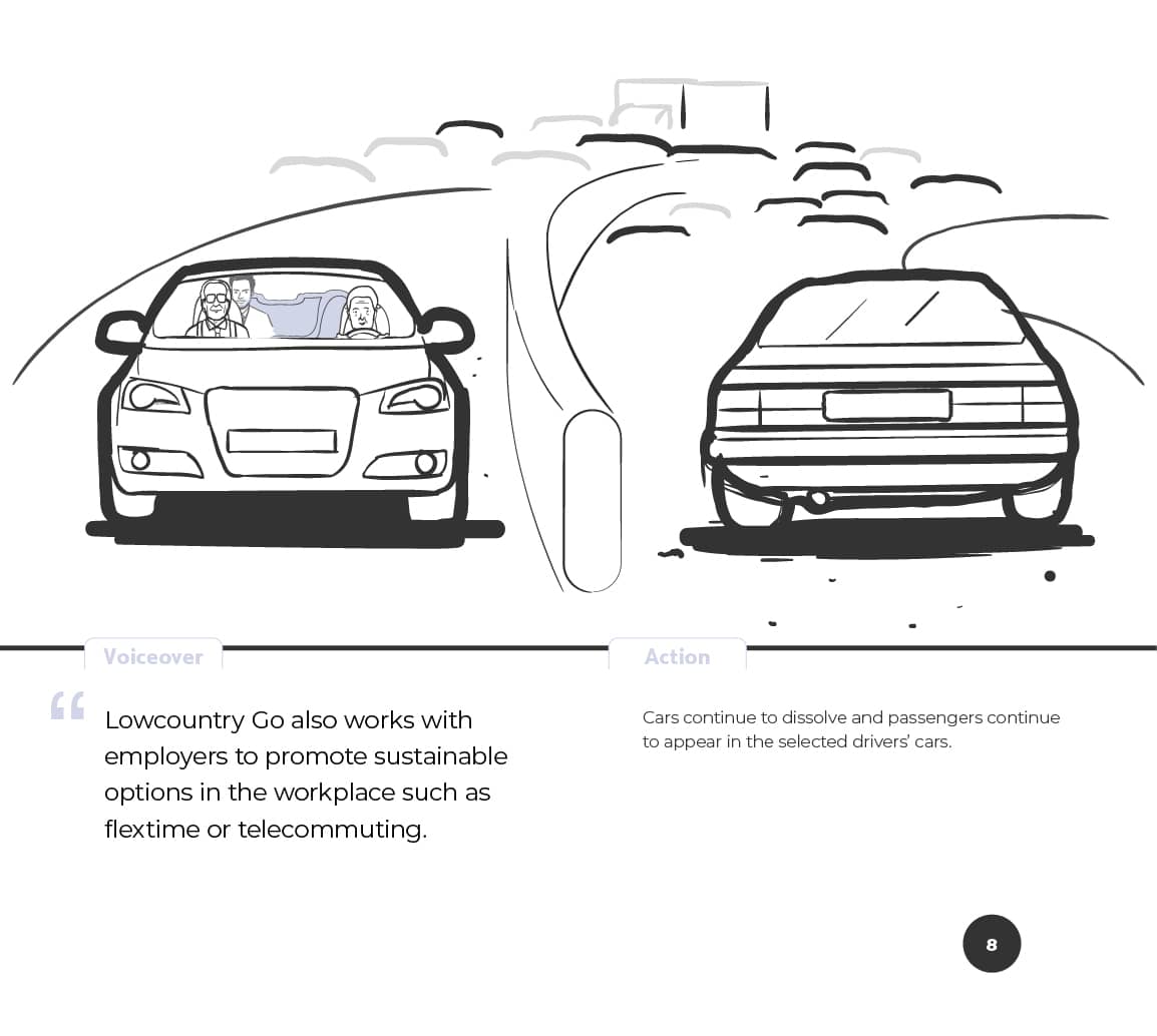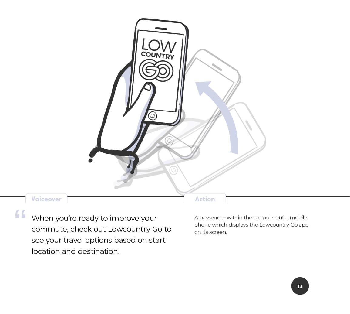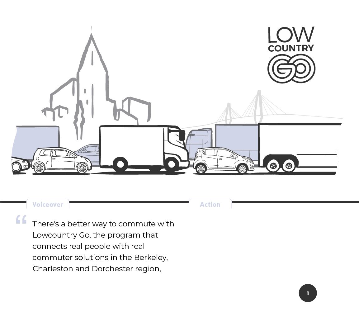 The following storyboards were created for an initiative of The Berkeley-Charleston-Dorchester Council of Governments. The Lowcountry GO initiative aims to reduce traffic congestion, improve environmental standards and urge daily commuters to seek alternative modes of transport. The effort was split into two videos, each highlighting a separate area of interest, one to describe the overall program and it’s intention, and the other to focus on the functionality of the initiative’s mobile app.