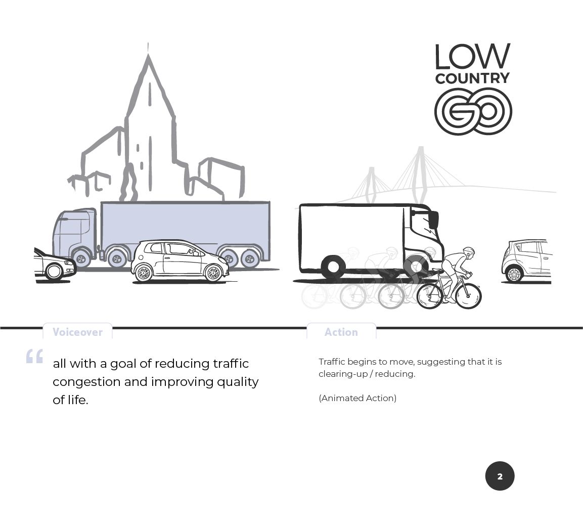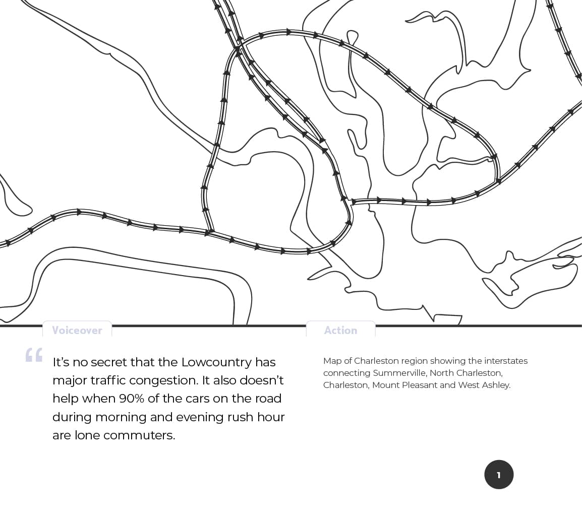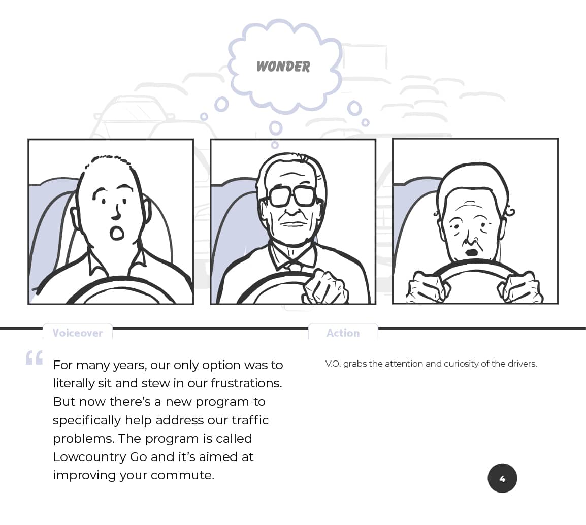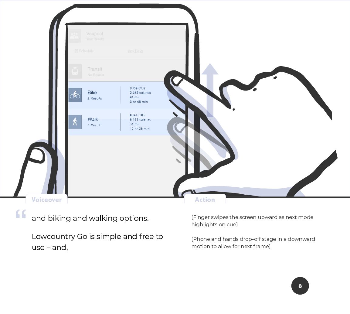 The following storyboards were created for an initiative of The Berkeley-Charleston-Dorchester Council of Governments. The Lowcountry GO initiative aims to reduce traffic congestion, improve environmental standards and urge daily commuters to seek alternative modes of transport. The effort was split into two videos, each highlighting a separate area of interest, one to describe the overall program and it’s intention, and the other to focus on the functionality of the initiative’s mobile app.